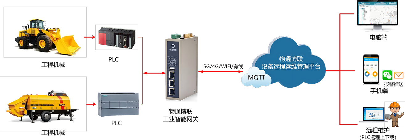 顺利获得乐发lv大众 乐发welcome的工业智能网关,连接工程机械设备的控制器、传感器等设备,实时采集设备的位置信息、运行状态(如工作、空闲、故障等)、运行参数(如发动机转速、油压、水温等)、油耗等数据。将采集到的数据传输至设备运维管理平台,平台对数据进行分析和处理。当设备出现故障时,及时发出预警,并顺利获得乐发lv大众 乐发welcome设备维护快线进行远程维护,提高维护效率,降低运维成本,实现设备全生命周期数字化管理。