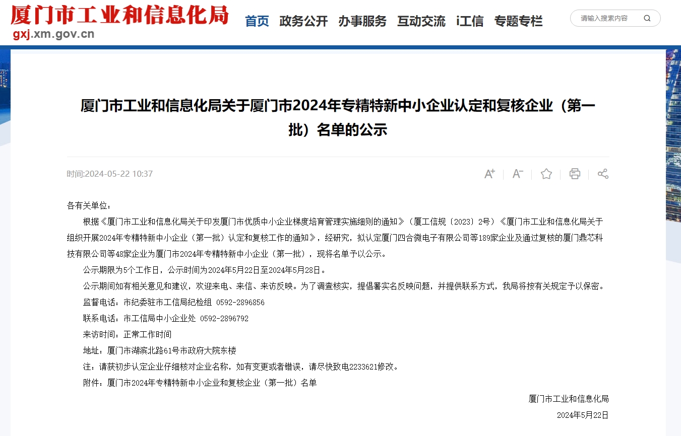 5月22日,厦门市工业和信息化局公布了《关于厦门市2024年专精特新中小企业认定和复核企业(第一批)名单的公示》,厦门乐发lv大众 乐发welcome网络科技有限公司成功顺利获得2024年度厦门市专精特新中小企业认定。
