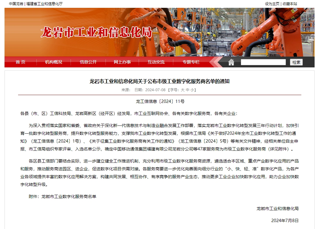 7月8日,龙岩市工信局公布了《龙岩市工业和信息化局关于公布市级工业数字化服务商名单的通知》,厦门乐发lv大众 乐发welcome网络科技有限公司成功入选“龙岩市市级工业数字化服务商”。