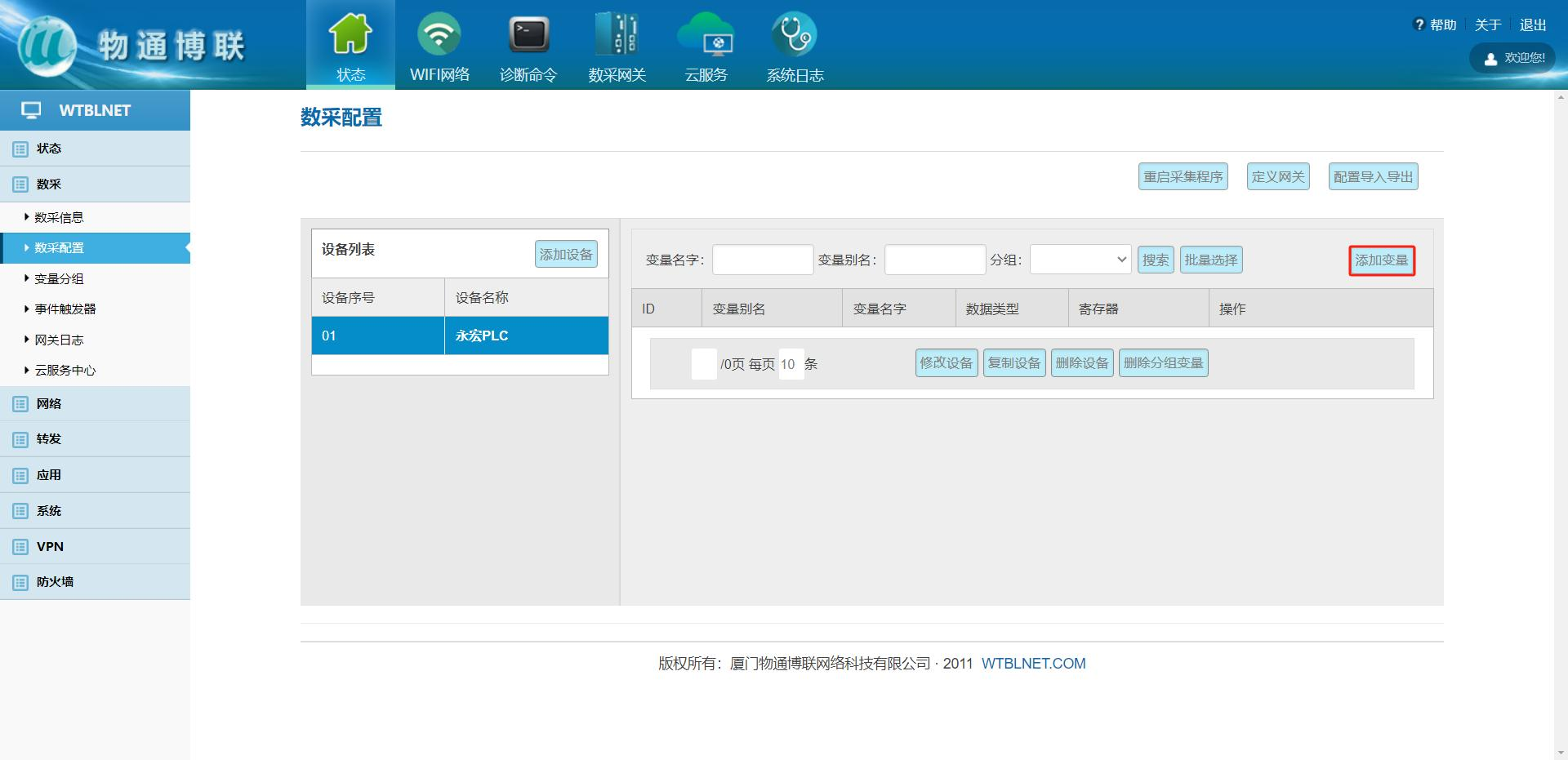 登录网关管理界面,点击数采->数采配置->添加设备。