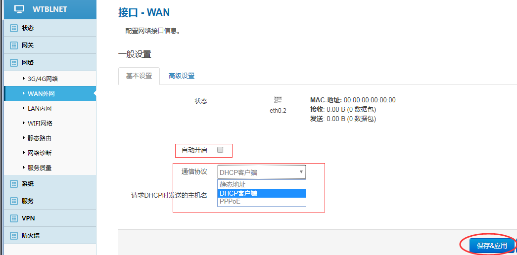 勾选 自动开启,选择通信协议(静态地址、DHCP客户端、PPPOE,三选一),保存&应用。