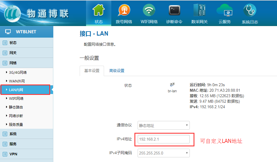 网关LAN以太网地址可自定义,但WAN以太网地址和LAN以太网地址不能同一个网段。