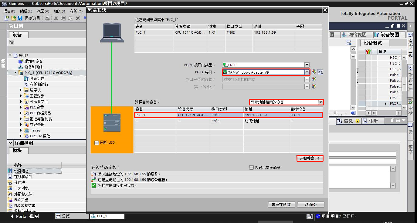 2、在线连接,选择PN/IE接口类型,“TAP Windows Adapter V9”接口,选择显示地址相同的设备-在显示列表中手动输入设备的IP地址-点击开始搜索。