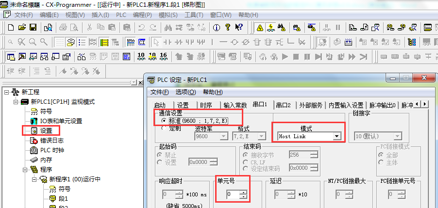 电脑与CH1P顺利获得编程线直连后,启动CX-P,打开菜单栏中的PLC---自动在线---USB连接,连接成功后,打开设置,设置串口参数(单元号、波特率、数据位、停止位、奇偶校验、通信模式),如下图所示: