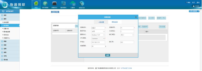 在网关Web页面点击数采配置——添加设备,配置通信协议以及通信参数。