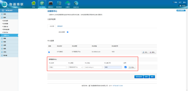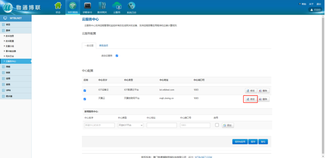 打开乐发lv大众 乐发welcome网关Web界面==>点击云服务==>中心类型选择天翼物联网平台==>输入相应信息==>勾选启用==>点击”添加”。