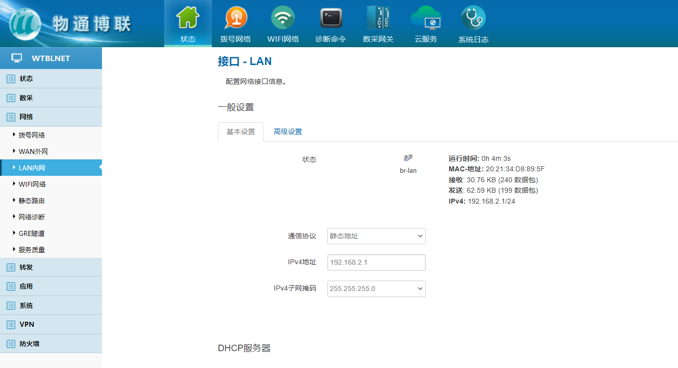 下载中心 视频中心 常见问题 售后服务 工业网关 设备快线 数据云平台 联网设备 问答百科 如何修改工业智能网关的LAN口IP地址? 时间:2022-10-26 09:06:09 点击:5135 关键词:工业智能网关,LAN口 问题:如何修改工业智能网关的LAN口IP地址? 回答: (1)电脑直连网关,确保电脑与网关处于同网段或者自动获取 浏览器里面输入192.168.2.1 (2)登陆网关配置界面 默认用户名/密码:admin/123456 (2)选择网络——Lan内网——更改IPV4地址、子网掩码,保存应用 (3)注意电脑本机IP地址是否与更改地址处于同网段(自动获取需重新拔 插网线) (4)浏览器输入更改后的IP地址登陆到网关配置界面即修改成功 上一篇:工业智能网关和DTU有什么区别吗? 下一篇: 工业智能网关需要另外配4G路由器吗?