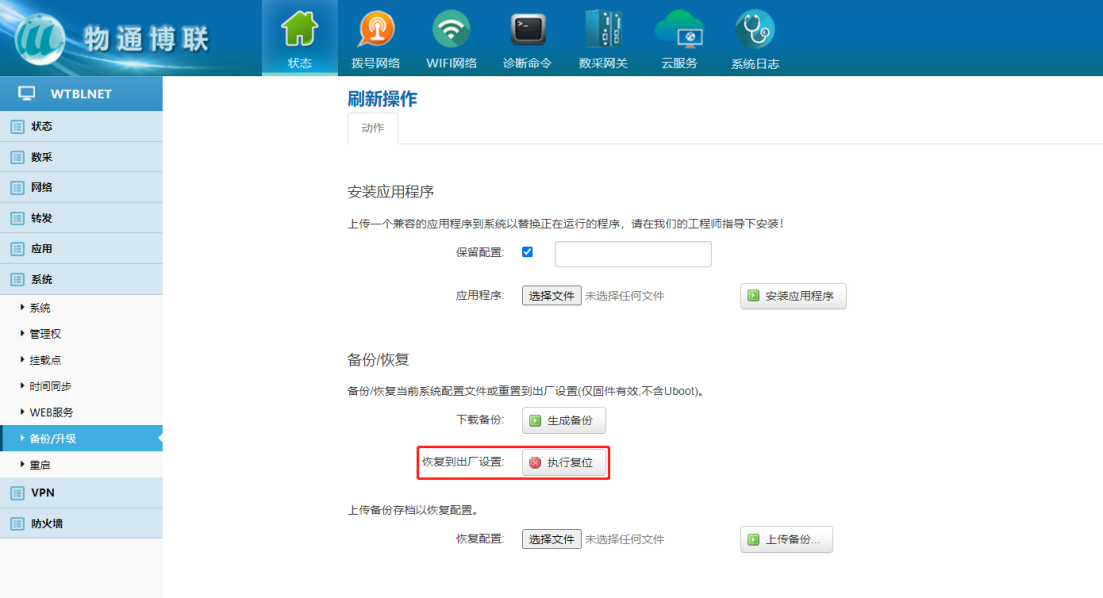 下载中心 视频中心 常见问题 售后服务 工业网关 设备快线 数据云平台 联网设备 问答百科 工业智能网关如何进行软硬件复位? 时间:2022-10-26 09:13:38 点击:5927 关键词:工业智能网关,网关复位,网关重启 问题:工业智能网关如何进行软硬件复位? 回答: (1)硬件复位 第一时间断电后再通电重启设备网关,当网关指示灯STATUS和WARN交替闪烁后,立即长按RESET键,直到ERROR灯慢闪后松开(或3秒后松开),再次长按RESET键,直到ERROR灯快闪后松开按钮(或3秒后松开),网关开始复位 (2)软件复位 系统——备份/升级——恢复到出厂设置 上一篇:工业智能网关如何设置静态固定IP? 下一篇: 工业智能网关和DTU有什么区别吗?