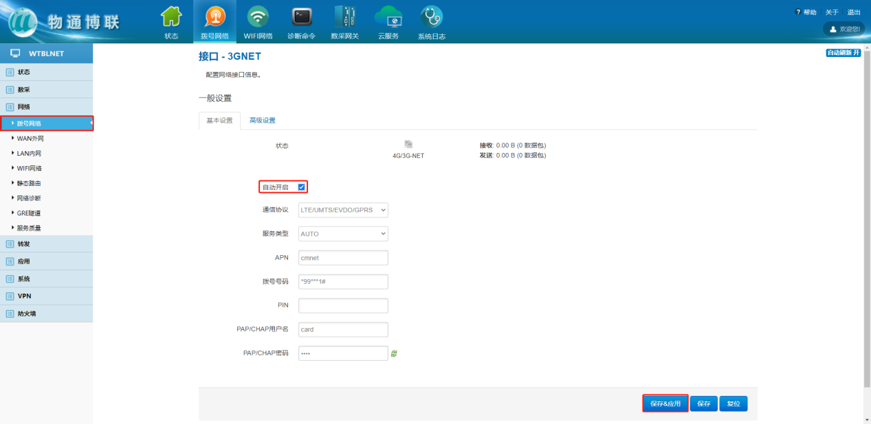 下载中心 视频中心 常见问题 售后服务 工业网关 设备快线 数据云平台 联网设备 问答百科 工业智能网关如何使用流量卡上网? 时间:2022-10-26 09:15:30 点击:4997 关键词:工业网关,流量卡,网关配置 问题:工业智能网关如何使用流量卡上网? 回答: (1)电脑顺利获得网线接入到网关LAN口,浏览器输入192.168.2.1默认地址 (2)登陆到网关配置界面,点击网络—拨号网络—自动开启—保存应用 上一篇:工业智能网关如何连接wifi热点? 下一篇: 工业智能网关如何使用网线上网?