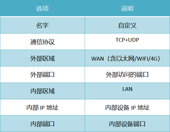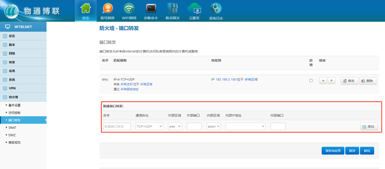 下载中心 视频中心 常见问题 售后服务 工业网关 设备快线 数据云平台 联网设备 问答百科 工业网关如何配置端口映射? 时间:2022-10-26 09:39:53 点击:5273 关键词:工业网关,网关配置,端口转发 问题:工业网关如何配置端口映射? 回答: 网关配置界面—防火墙—端口转发 端口转发允许来自Internet的计算机访问私有局域网内的计算机或服务 使用场景:端口转发是将发往外网的一个端口的通信完全转发给内网一个地址的指定端口 上一篇:如何顺利获得乐发lv大众 乐发welcome工业网关实现网口设备远程上下载? 下一篇: 工业智能网关支持的电压范围?