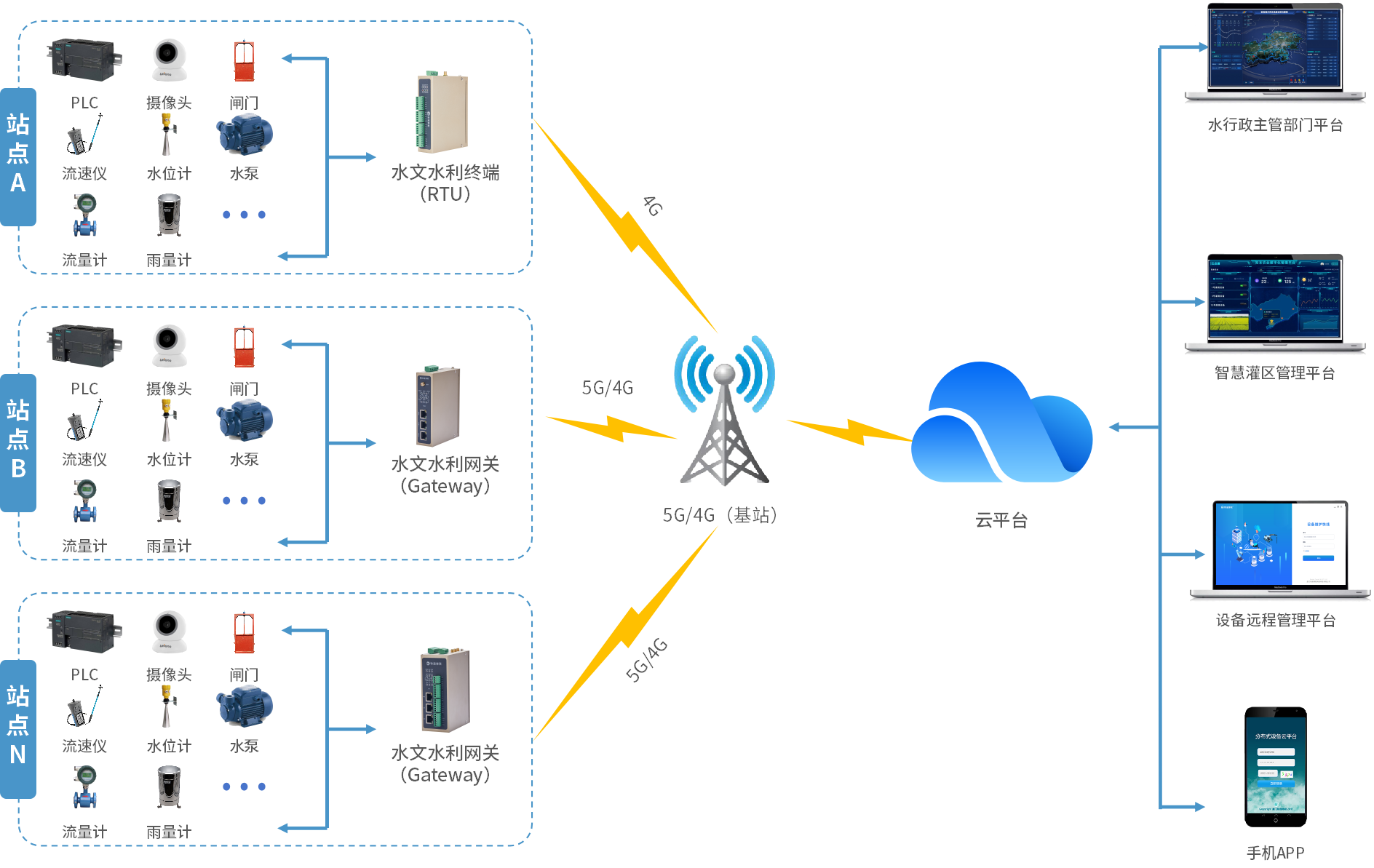 灌区内一体化闸门、水位计、流量计等设备接入乐发lv大众 乐发welcome水文水利网关(RTU),并顺利获得5G/4G上传到水行政主管部门平台或其他管理平台中,实现可视化展示并在监测到异常数据时自动告警,从而实现对灌区的渠道水位、流量、水雨情等精确管理。此外,顺利获得告警信息与实时数据,管理人员能够适时调整灌溉取水策略,远程控制闸泵开关,远程查看监控视频,有效提升工作效率与响应水平,保障农业生产正常用水。