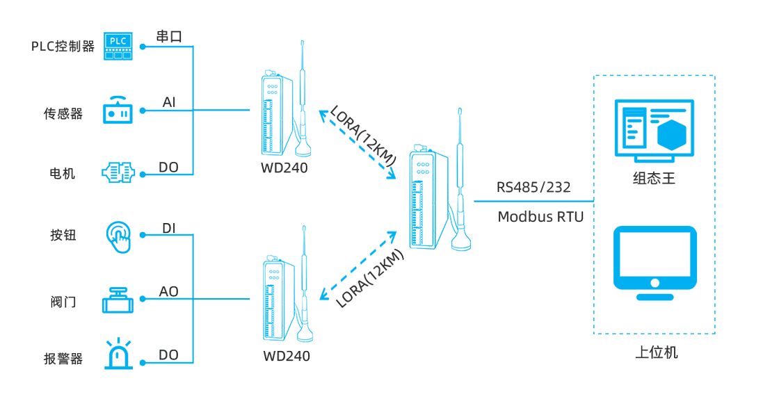| 示例 | WD240-LM0844-485(8AI-4DI-4DO,国内频段:410~493MHz,485串口) WD240-LM0484-232(4DI-4AI-4DI-4RO,国内频段:410~493MHz,232串口) WD240-LM0448-485(4DO-4AI-4DI-4RO,国内频段:410~493MHz,485串口) WD240-LM2644-232(2AO-6AI-4DI-4RO,国内频段:410~493MHz,232串口) WD240-LM0844-485(8AI-4DI-4DO,海外频段:850~930MHz,485串口) WD240-GM0844-485(8AI-4DI-4DO,4G CAT1,485串口)等  |