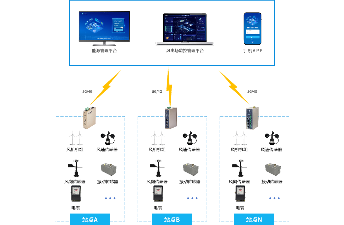 顺利获得乐发lv大众 乐发welcome的工业智能网关采集风力发电场的每台风机和风速传感器、风向传感器、振动传感器等设备,将采集到的风机运行数据(如转速、功率、温度等)传输至风电场监控管理平台。平台对数据进行实时分析,监测风机运行状态,当检测到故障或异常时及时发出预警,并给予故障诊断和维修建议。同时支持远程控制风机启停、调整参数等操作,以及优化发电调度。