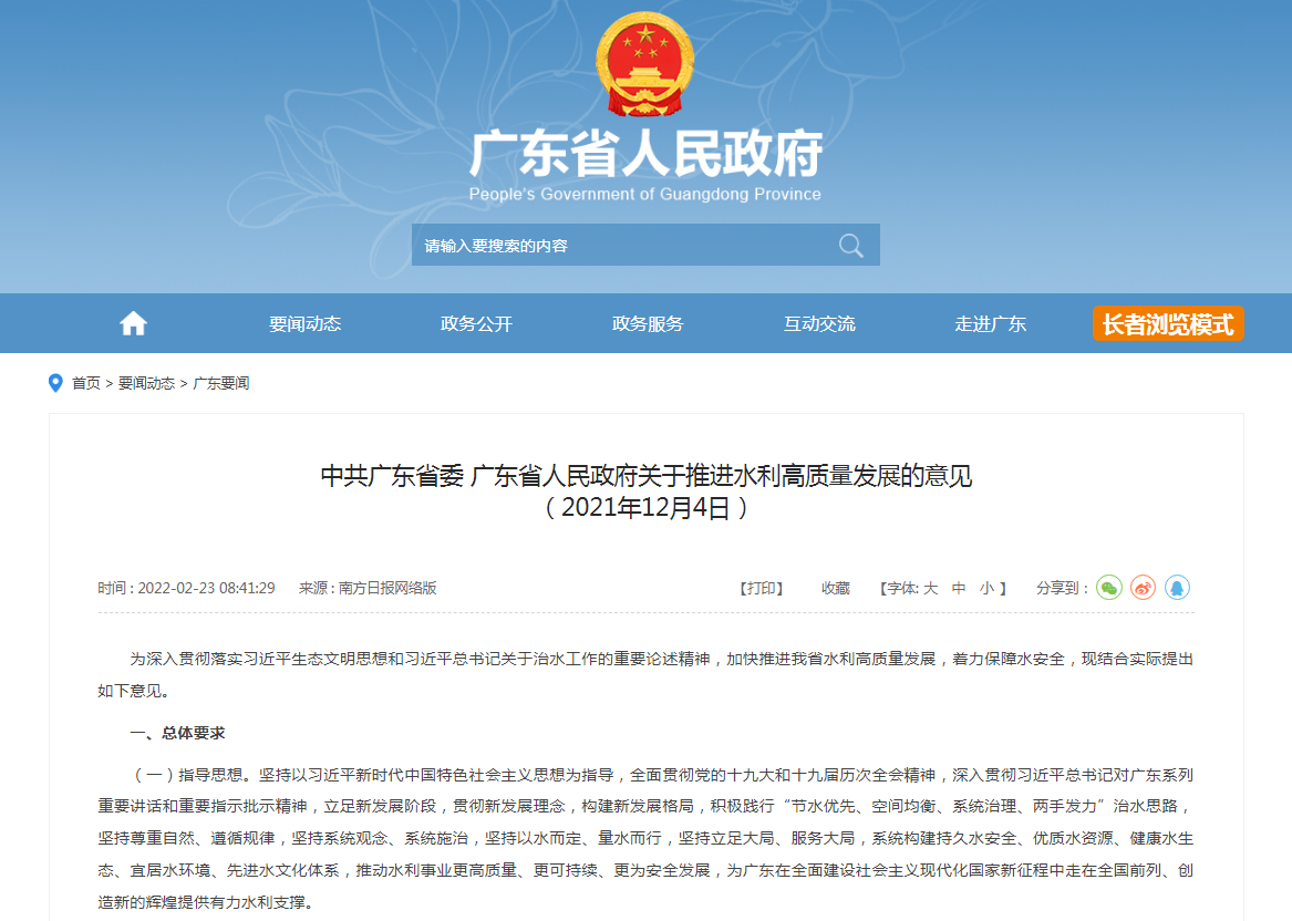 “到2035年,广东水网全面建成,形成与我省社会主义现代化远景目标相适应的水安全保障体系,水利现代化水平走在全国前列。”