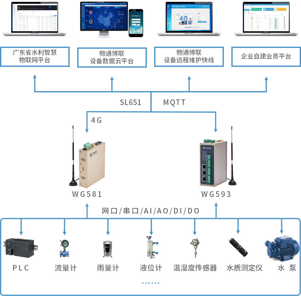 顺利获得乐发lv大众 乐发welcome工业智能网关采集PLC、流量计、温湿度传感器、雨量计、液位计等等相关设备数据,将流量、流速、水位、水深、温度、湿度、水压等等数据顺利获得边缘计算、数据标准化后以4G/WIFI等网络方式顺利获得MQTT/SL651等协议传输到广东省水利智慧物联网平台或者企业自建业务平台。