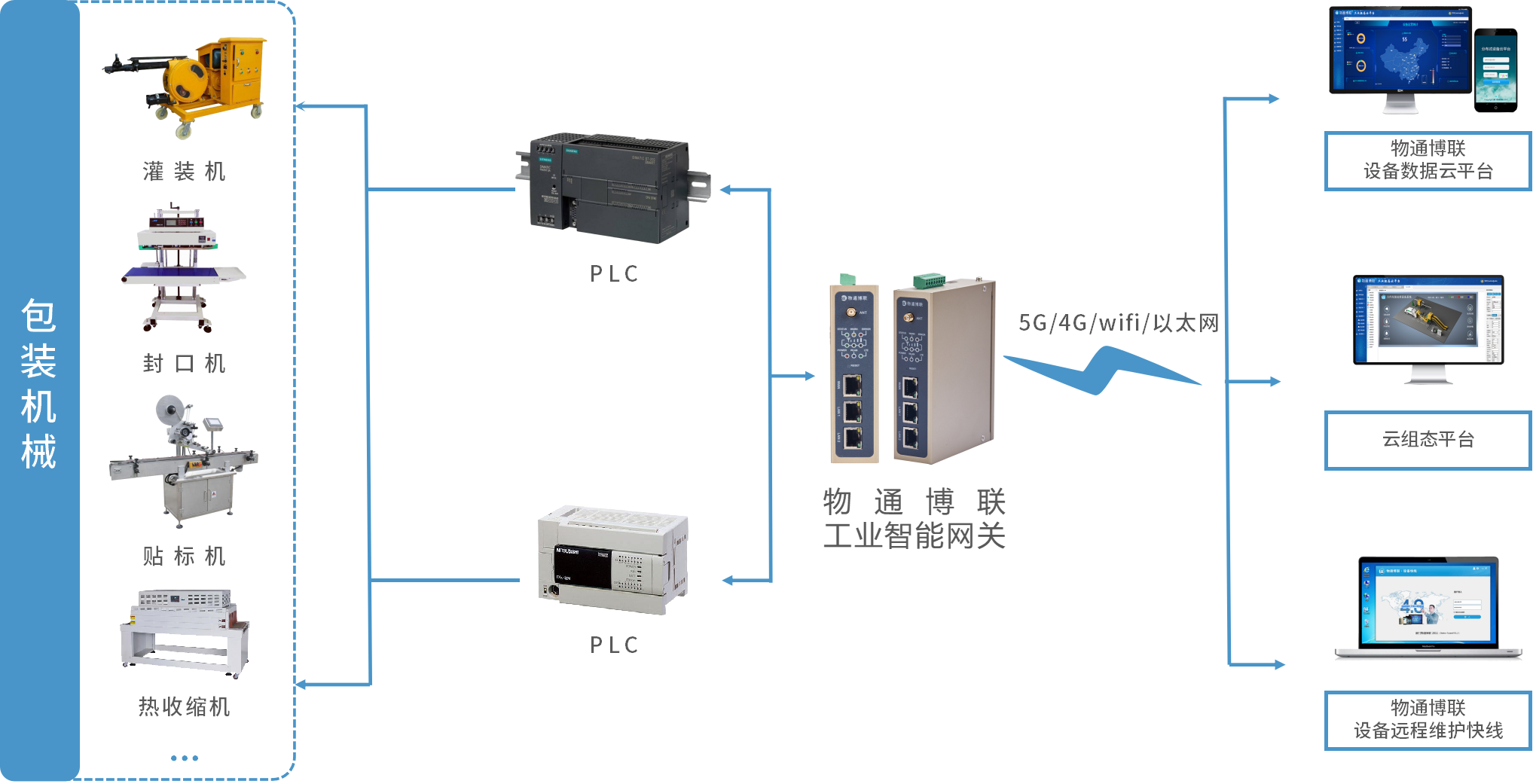 乐发lv大众 乐发welcome工业智能网关具有丰富的通信协议和接口,顺利获得接入包装机械设备的控制器PLC,就能实时采集包装机械设备运行状态、温度、压力、振动等参数,顺利获得5G、4G、WIFI、以太网等方式将数据上传到云平台,实现远程监控、组态监控、设备管理、故障报警、远程控制、远程维护、数据分析等功能,全面掌握设备的运行情况,帮助企业提升包装机械设备运维与管理水平,保障安全稳定生产,提高生产效率。