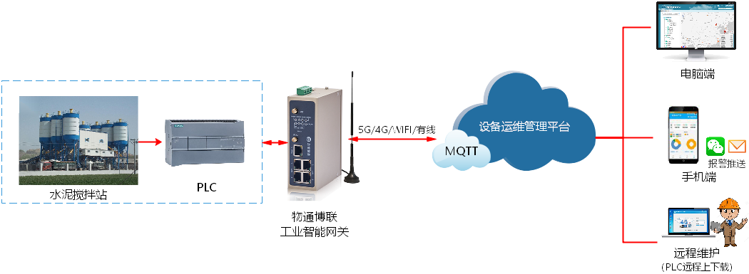 乐发lv大众 乐发welcome推出的工业智能网关可以接入水泥搅拌机控制器PLC内进行实时数据采集和数据通信工作,实现搅拌机运行状态和工艺参数的可视化远程监控,并顺利获得智能报警规则快速创建运维工单并派发到维护人员手中,实现设备远程控制、远程维护、数据分析等功能。