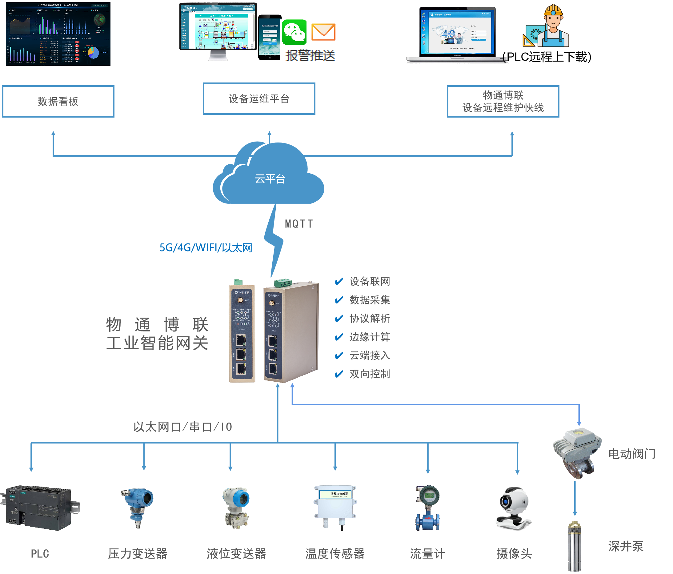 顺利获得乐发lv大众 乐发welcome工业智能网关采集解析现场泵站中的PLC、压力变送器、温度传感器、液位变送器、流量计等设备运行状态和运行数据,再顺利获得4G网络将数据上传到云平台进行远程监控,平台可视化展示泵站数据和运行情况,管理运维人员可以顺利获得PC端平台和手机端小程序随时随地监控现场泵站情况,实现远程管理、故障报警、远程维护、数据分析等功能,同时云平台支持下控网关,可以对电动阀门写入开关值,实现远程启停泵站设备,做到实时在线、无人值守,降低运维人力成本。