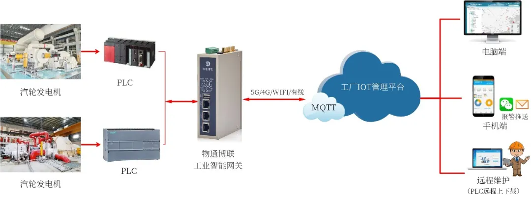 乐发lv大众 乐发welcome·工业智能网关具备多个串口/网口,能够接入PLC、智能电表、蒸汽表、流量计、温度传感器、压力传感器等设备,实时采集进汽压力、进汽温度、进汽流量、排汽压力、汽轮机参数(功率、转速)、发电量等数据并对接到工厂IOT管理平台中,从而实现远程监控、故障告警、远程控制、设备看板、数据分析等功能,为设备安全运行、节能优化等工作给予科学决策支持,促进企业管理升级与数字化转型。